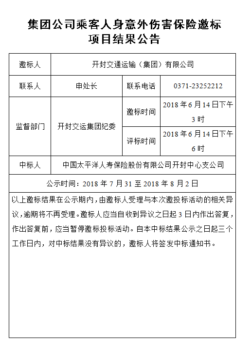 集团公司乘客人身意外伤害保险邀标 项目结果公告