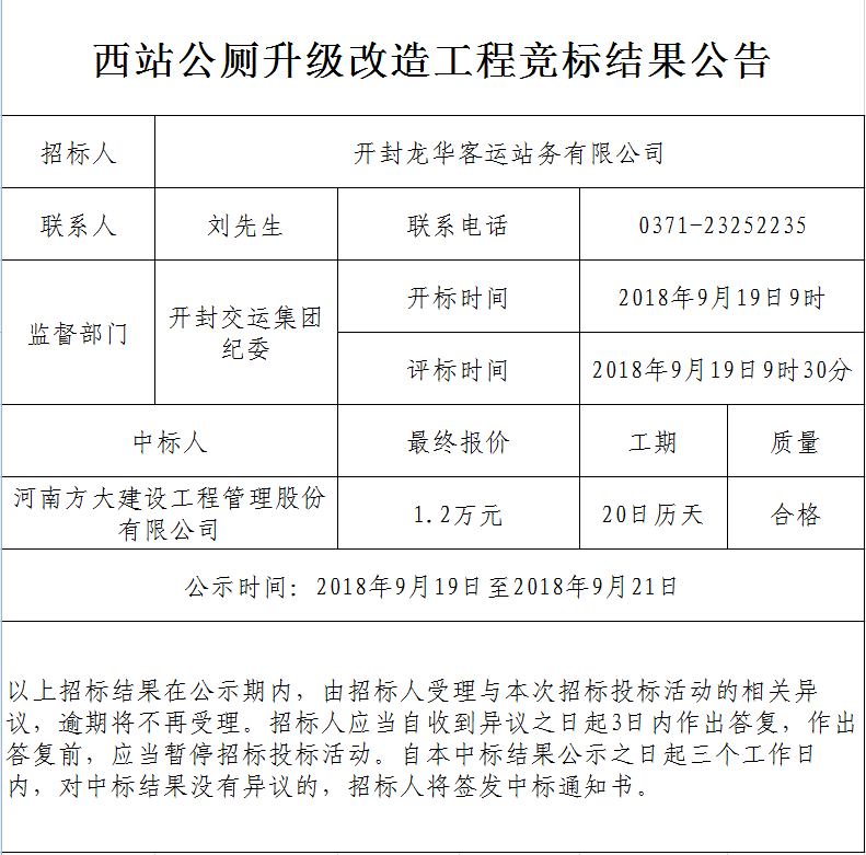 西站公厕升级改造工程竞标结果公告