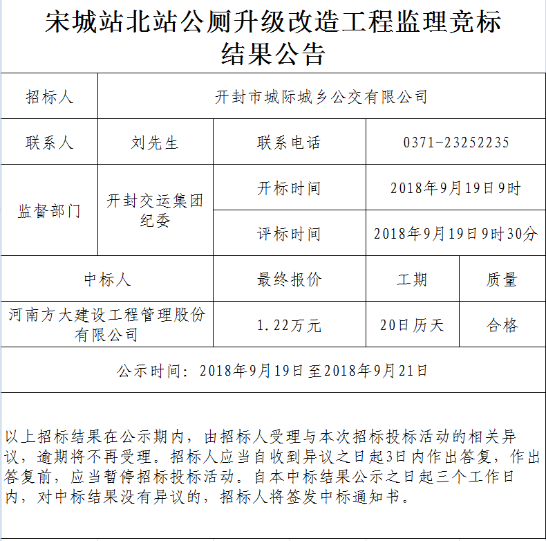 宋城站北站公厕升级改造工程监理竞标结果公告